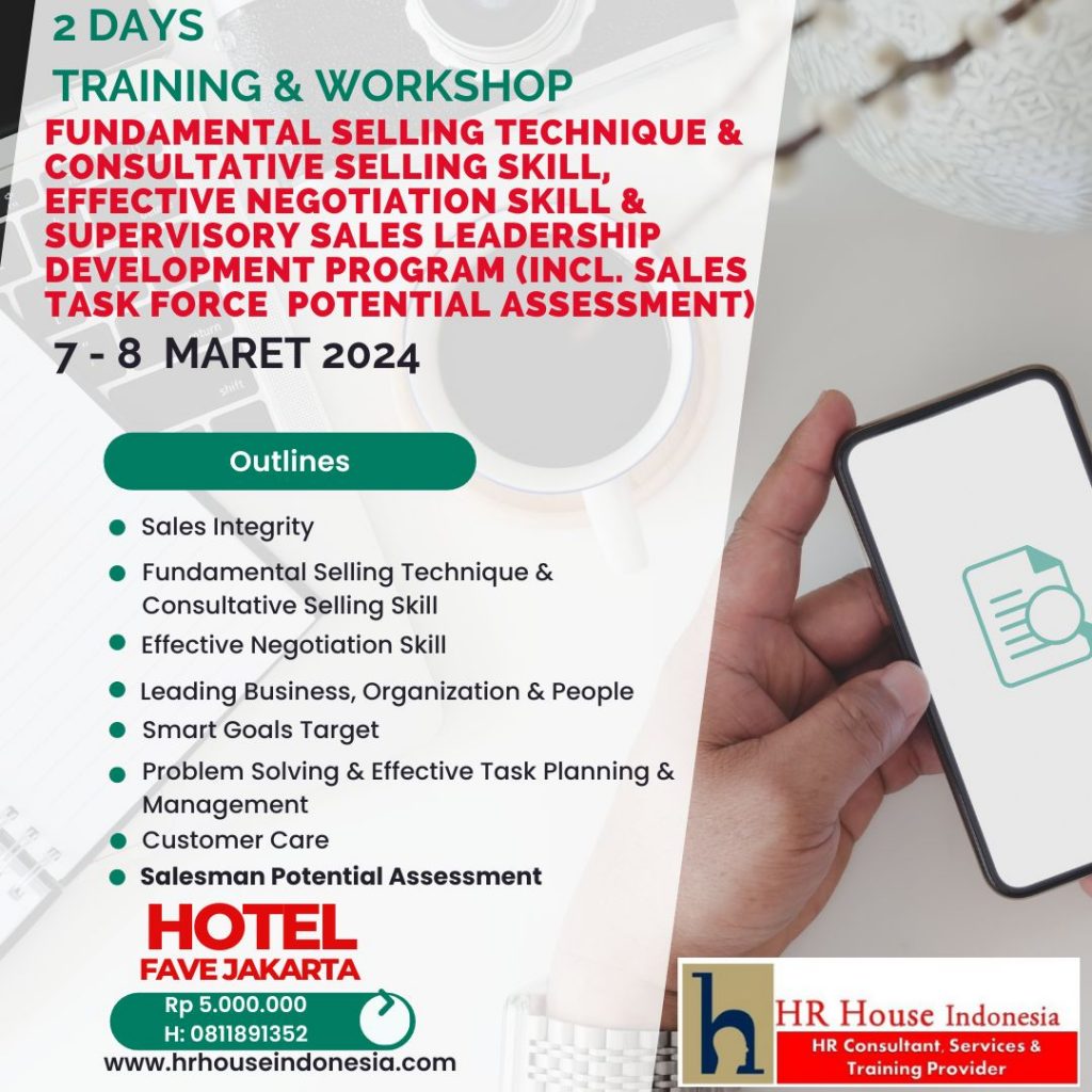 2 DAYS TRAINING & WORKSHOP FUNDAMENTAL SELLING TECHNIQUE, CONSULTATIVE SELLING SKILLS, EFFECTIVE NEGOTIATION & SUPERVISORY SALES LEADERSHIP DEVELOPMENT PROGRAM 7 – 8 MARET 2024 HOTEL FAVE JAKARTA (PUBLIC COURSE) – AWARENESS TRAINING & WORKSHOP