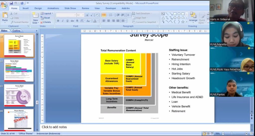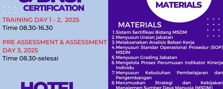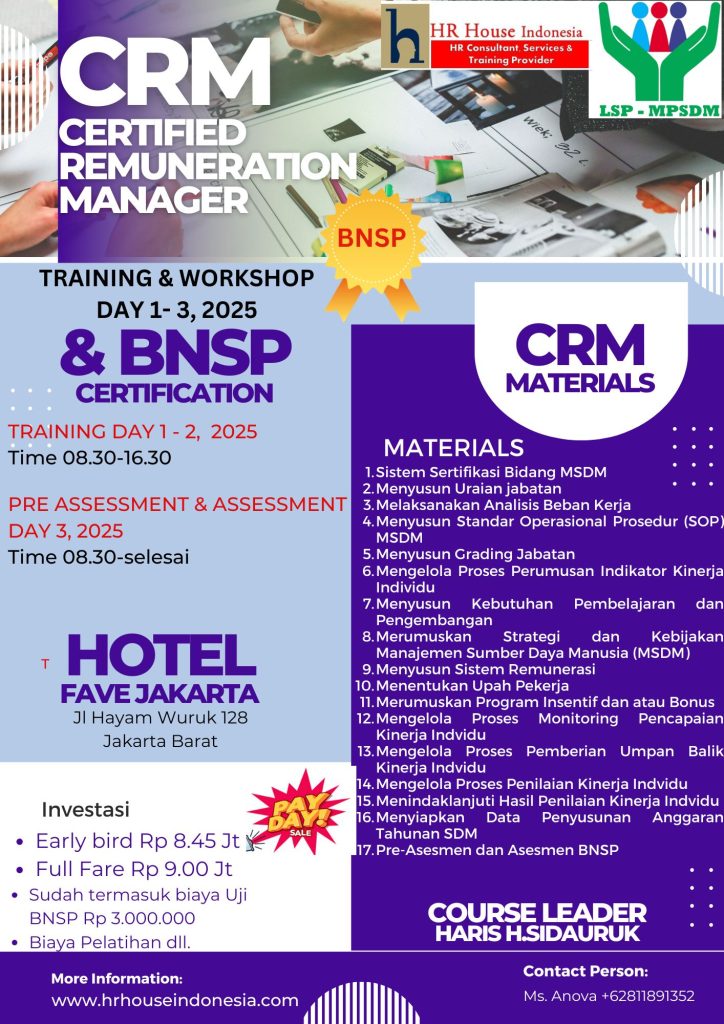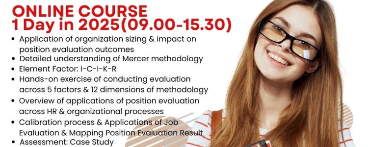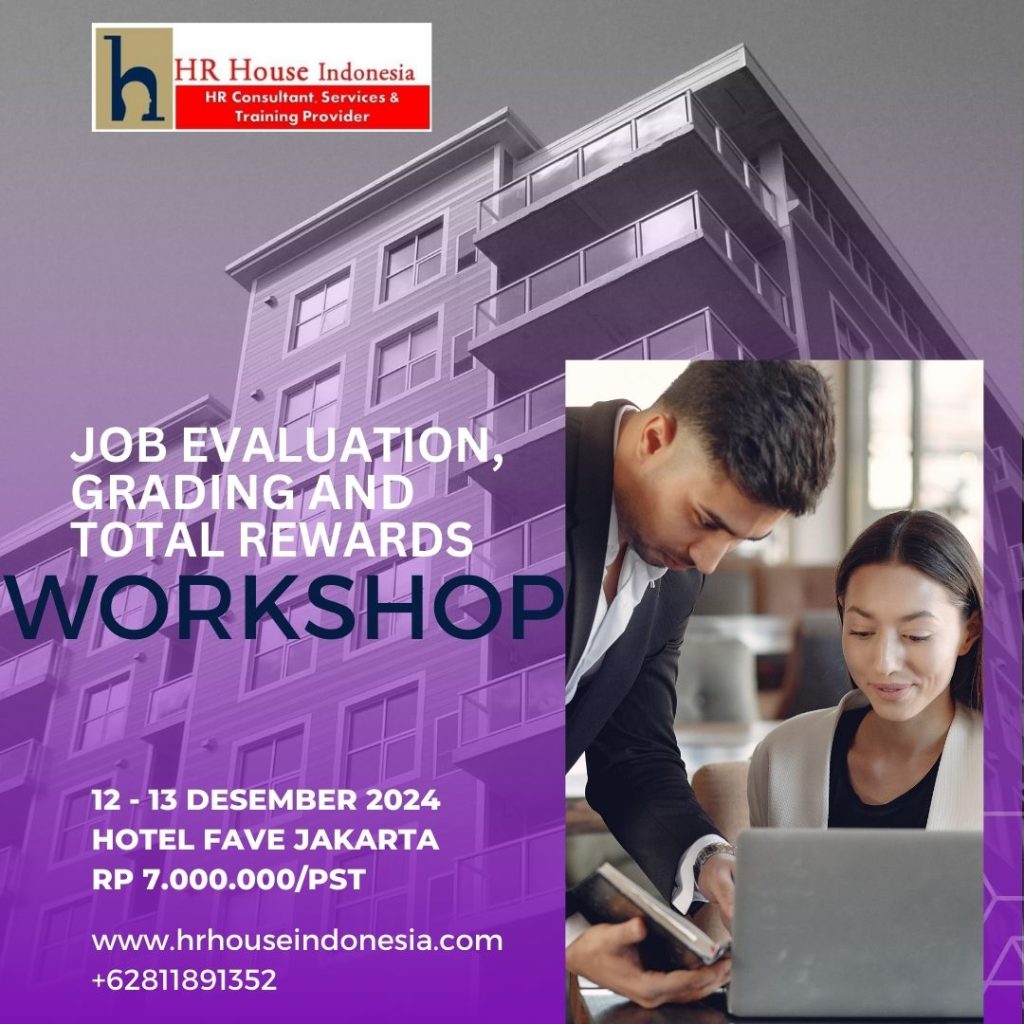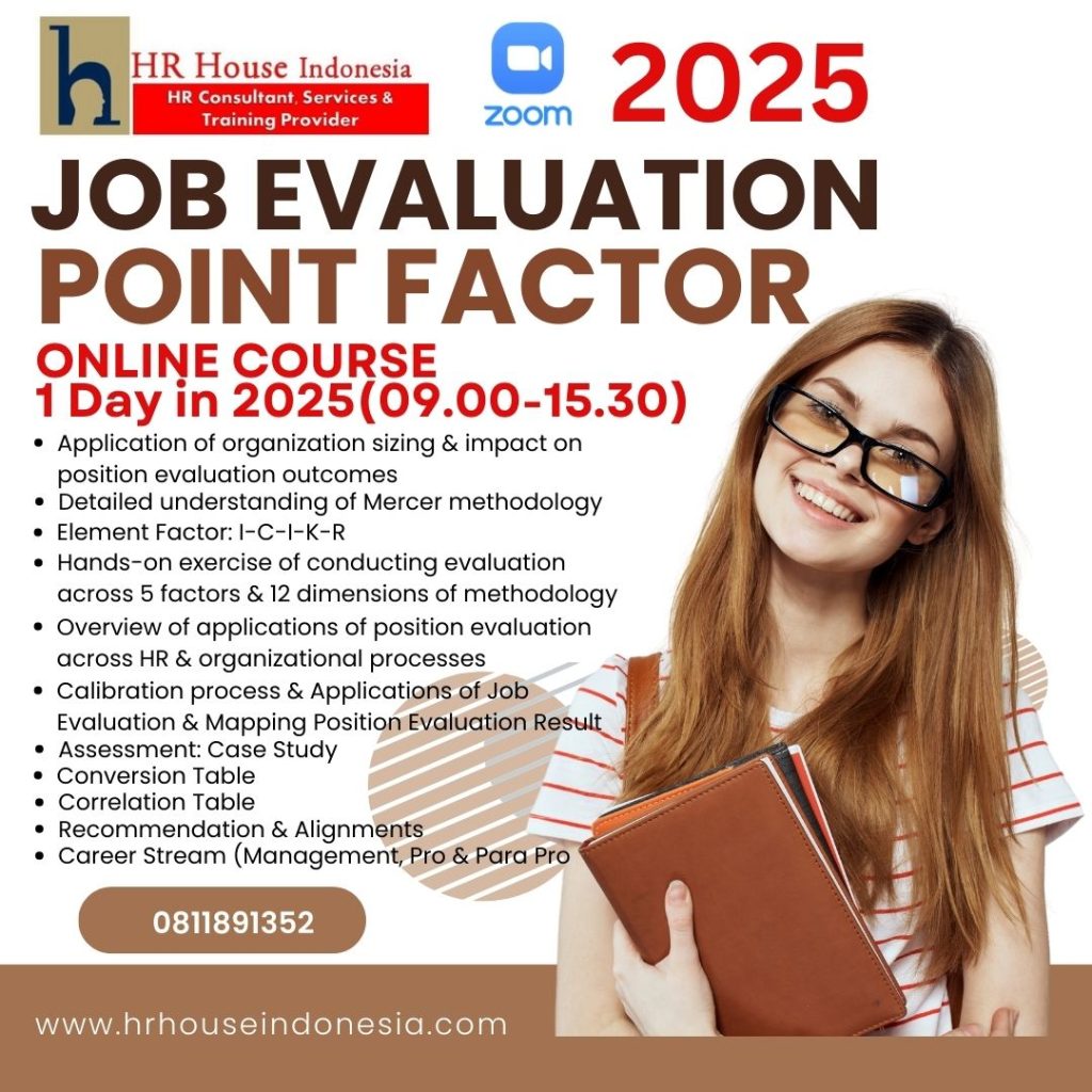 Melakukan pembandingan secara akurat, memastikan pentingnya dan peran jabatan dapat membuat proses peninjauan dan penawaran remunerasi (upah misalnya) menjadi sulit. Dengan pemahaman yang lebih baik tentang analisis peran dan evaluasi jabatan. Anda dan tim HR akan dapat mengelola keputusan remunerasi dengan lebih lancar dan lebih hemat biaya. Zoom class workshop tentang evaluasi jabatan menggunakan 3 metodologi Job Eva dan penerapannya dalam organisasi.