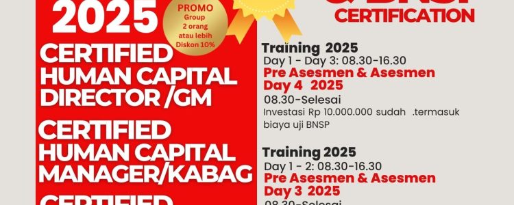 BNSP AGENDA 2025 INHOUSE TRAINING & PUBLIC PELATIHAN 𝐒𝐄𝐑𝐓𝐈𝐅𝐈𝐊𝐀𝐒𝐈 𝐁𝐍𝐒𝐏 𝐊𝐎𝐌𝐏𝐄𝐓𝐄𝐍𝐒𝐈 𝐌𝐒𝐃𝐌 SEMUA SKEMA MSDM & TOT : CHC DIRECTOR – CHCGM – 𝐂𝐇𝐂𝐌 – CHCH – 𝐂𝐇𝐂𝐒 – 𝐂𝐇𝐂𝐎/𝐒 – CODM – CIRM – CRM – CTDM – CTMM, BNSP TOT TRAINING OF TRAINER KKNI LEVEL 3, 4, 5 DAN TOT KKNI LEVEL 6 𝐁𝐍𝐒𝐏 𝐑𝐈 𝐇𝐑 𝐇𝐎𝐔𝐒𝐄 𝐈𝐍𝐃𝐎𝐍𝐄𝐒𝐈𝐀 (𝐅𝐔𝐋𝐋 𝐎𝐅𝐅 𝐋𝐈𝐍𝐄 𝐂𝐋𝐀𝐒𝐒)