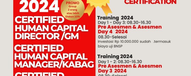 HR HOUSE INDONESIA sebagai lembaga diklat profesi dan Tempat Uji Kompetensi/Sertifikasi bidang MSDM (Manajemen Sumber Daya Manusia) membimbing profesional hingga meraih sertifikasi profesi Badan Nasional Sertifikasi Profesi (BNSP) Republik Indonesia. 3 Skema Certified Human Capital BNSP ini sejalan dengan keputusan Menaker No. 115 Tahun 2022 tentang Pemberlakuan Wajib Sertifikasi Kompetensi Kerja bagi Tenaga Kerja Bidang Manajemen Sumber Daya Manusia