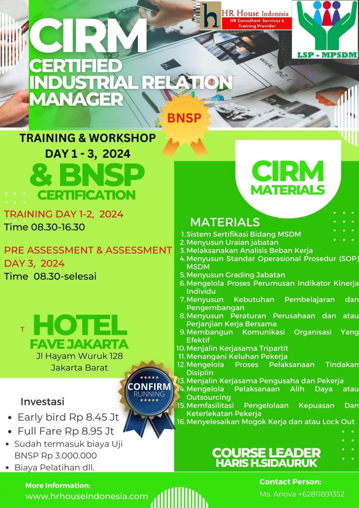 HR HOUSE INDONESIA sebagai lembaga diklat profesi dan Tempat Uji Kompetensi/Sertifikasi bidang MSDM (Manajemen Sumber Daya Manusia) membimbing profesional hingga meraih sertifikasi profesi Badan Nasional Sertifikasi Profesi (BNSP) Republik Indonesia. Skema Certified Human Capital Manager (CHCM) BNSP ini sejalan dengan Keputusan Menaker No. 115 Tahun 2022 tentang Pemberlakuan Wajib Sertifikasi Kompetensi Kerja bagi Tenaga Kerja Bidang MSDM Manajemen Sumber Daya Manusia.