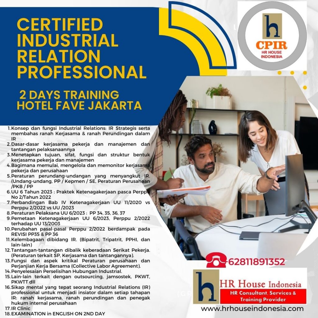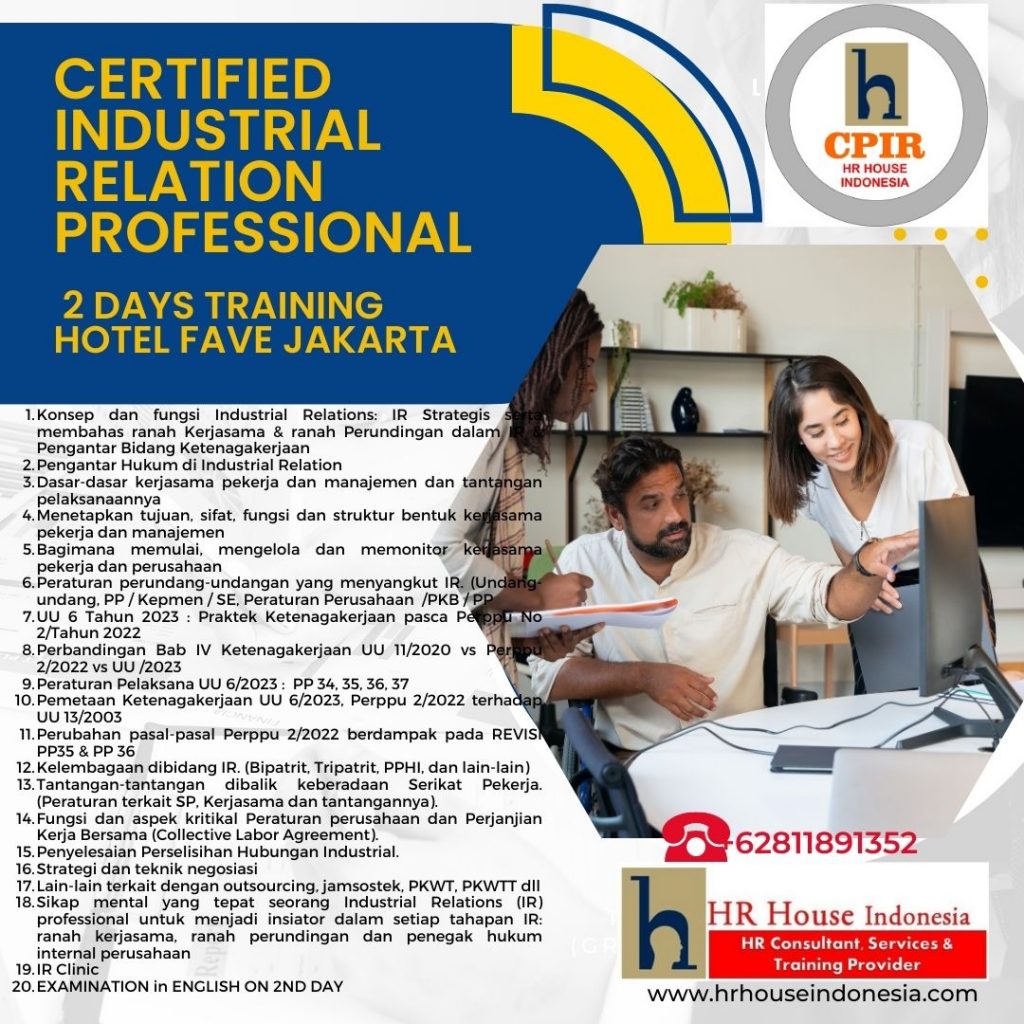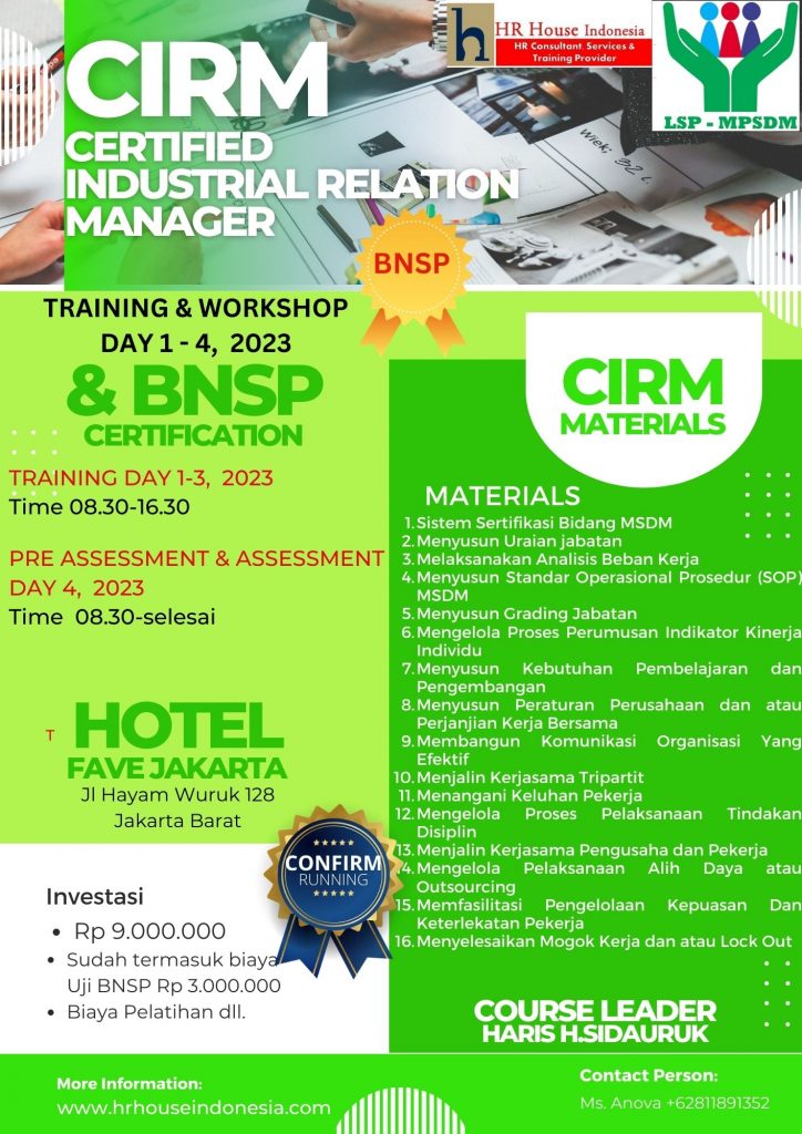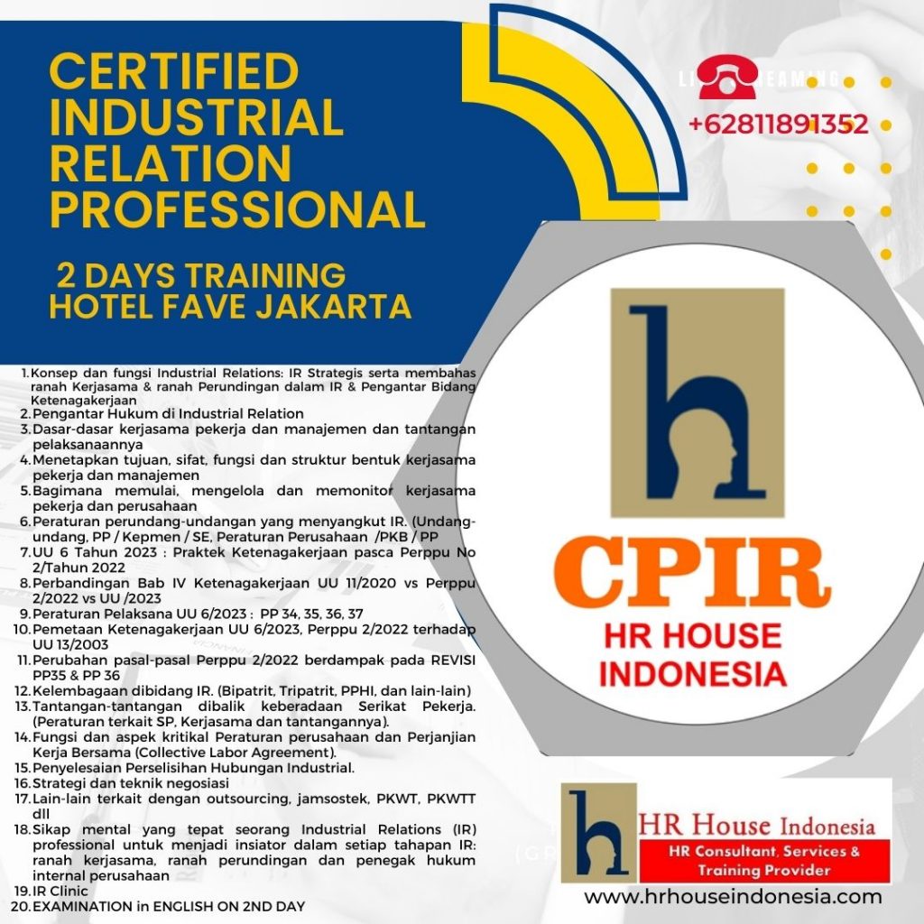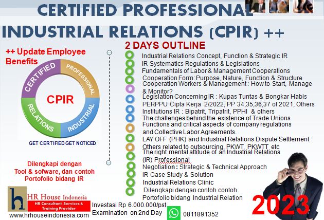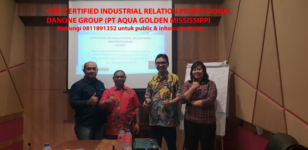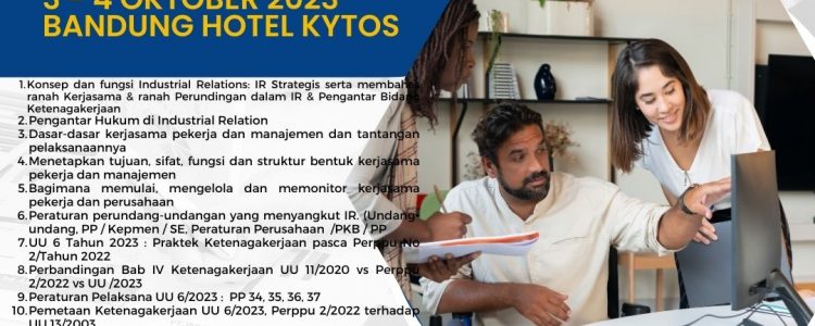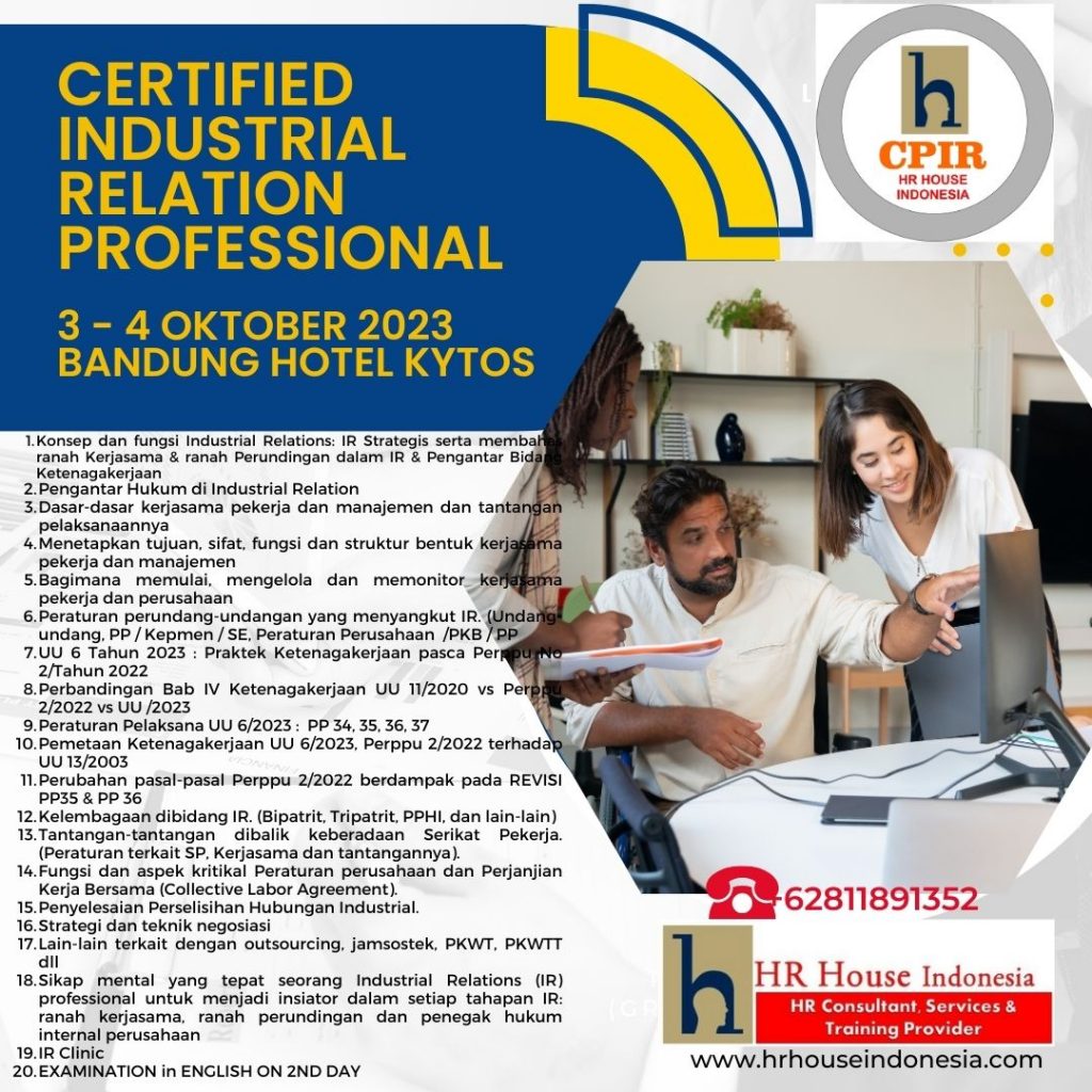 BANDUNG Certified Industrial Relations Professional (CPIR) HOTEL KYTOS BANDUNG 3 – 4 OKTOBER 2023. Hub 0811891352 (Gambar) Diikuti oleh perusahaan MULTI NATIONAL COMPANY (mengedukasi union group).