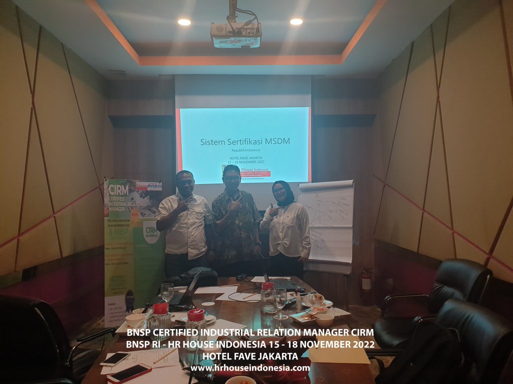 HR HOUSE INDONESIA sebagai lembaga diklat profesi dan Tempat Uji Kompetensi/Sertifikasi bidang MSDM (Manajemen Sumber Daya Manusia) membimbing profesional hingga meraih sertifikasi profesi Badan Nasional Sertifikasi Profesi (BNSP) Republik Indonesia. Skema Certified Industrial Relation Manager (CIRM) BNSP ini sejalan dengan Keputusan Menaker No. 115 Tahun 2022 tentang Pemberlakuan Wajib Sertifikasi Kompetensi Kerja bagi Tenaga Kerja Bidang MSDM Manajemen Sumber Daya Manusia.