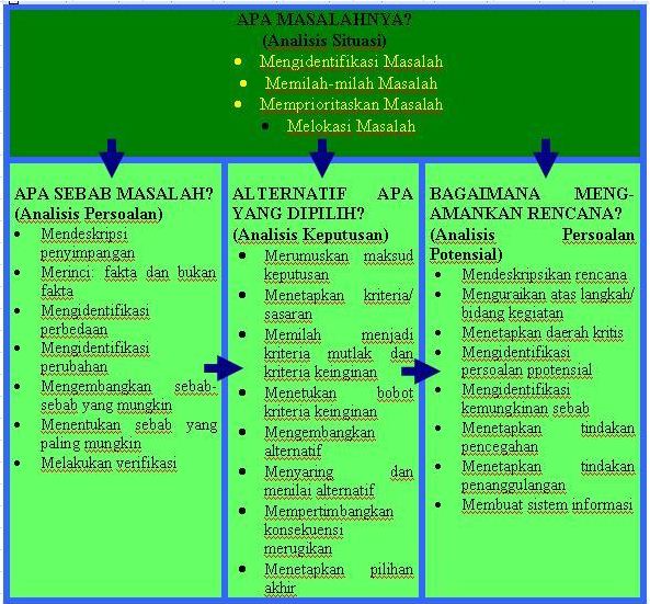 Diagram di atas menunjukkan bahwa mutu keputusan seharusnya dapat ditingkatkan bila aspek masukan dan prosesnya diperbaiki. Proses berpikir yang bermutu adalah proses berpikir yang sistematis dan rasional. Untuk itu diperlukan alat dan metode analisis masalah yang sesuai dengan masalah yang dihadapi. Pelatihan ini akan membahas empat metode analisis masalah yaitu: Analisis Situasi, Analisis Persoalan, Analisis Keputusan, dan Analisis Persoalan Potensial. Jika ingin mengetahui masalah yang sedang dihadapi, metode yang digunakan adalah Analisis Situasi. Jika ingin mencari sebab, Analisis Persoalan yang dipakai, jika ingin mengambil keputusan, gunakan Analisis Keputusan, dan terakhir jika ingin mengamankan pelaksanaan rencana, pakailah Analisis Persoalan Potensial.