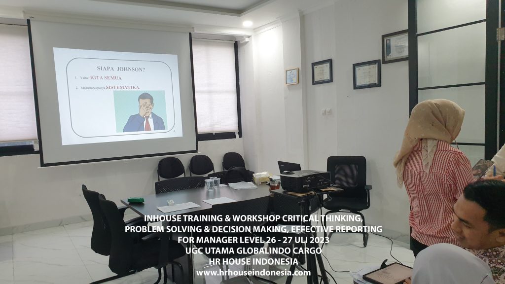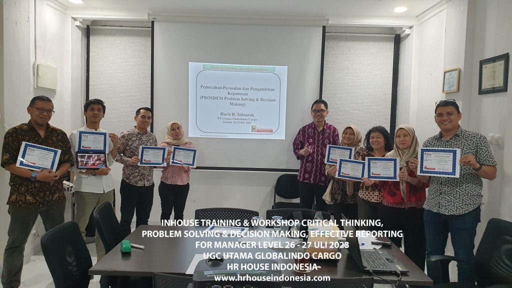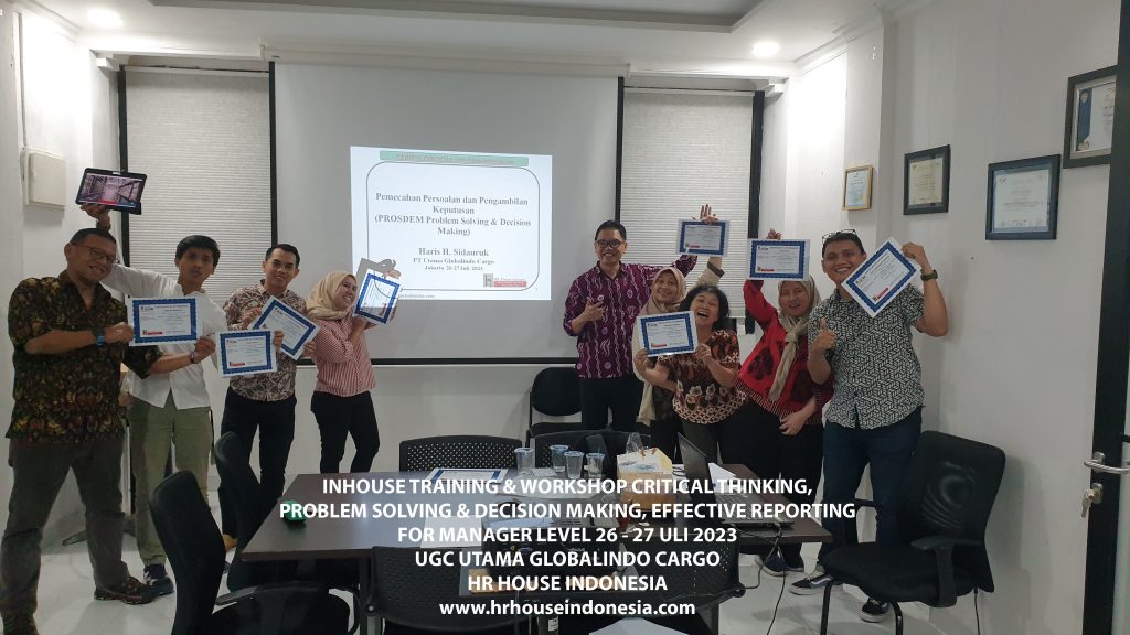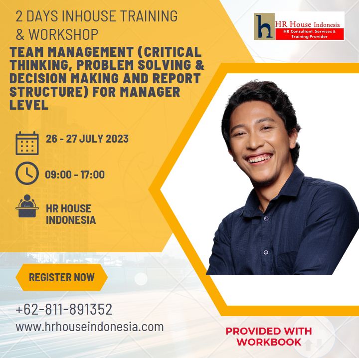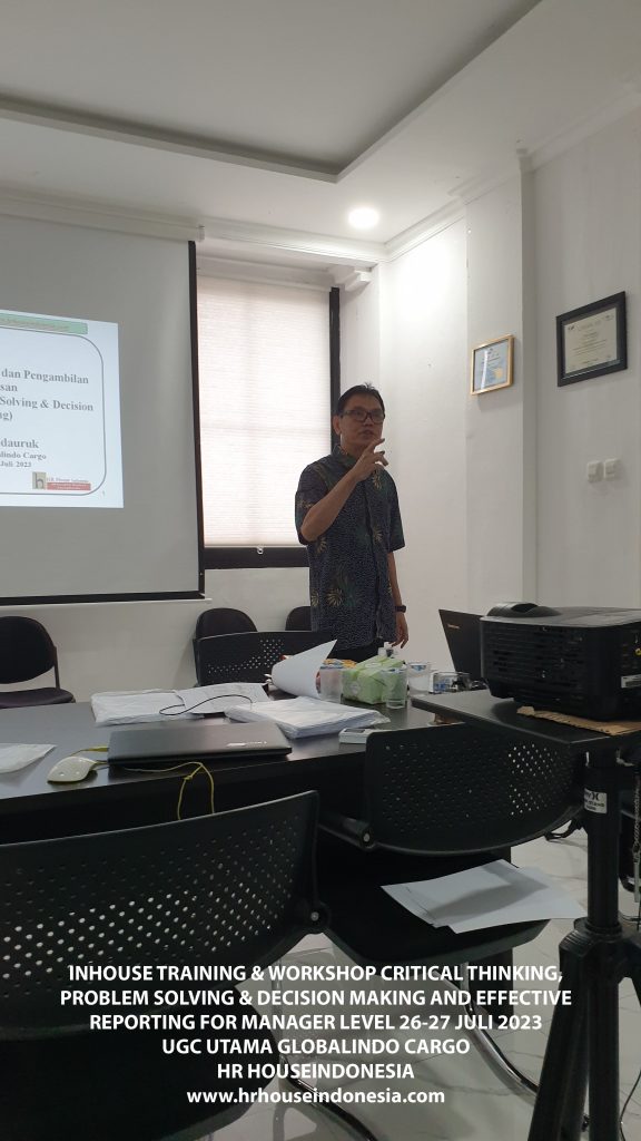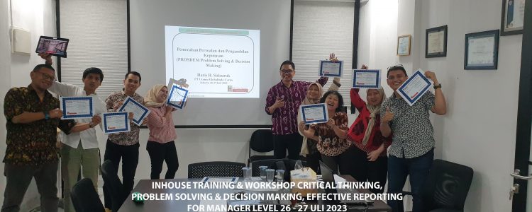 Program pelatihan 3 IN 1 Critical Thinking skill, Problem Solving & Decision Making serta Effective Report Structure ini dirancang agar para manager dapat memahami konsep dalam proses mengevaluasi tujuan/masalah berdasarkan data serta fakta dan kemudian membuat alternatif solusi yang mungkin dilakukan. Perlu melatih cara membentuk bagaimana berpikir yang kritis. Kami percaya bahwa skills ini akan membantu semua individu dan tim secara efektif mendefinisikan masalah serta solusi yang sebelumnya tidak terlihat secara jelas dan melakukan dengan step langkah terstruktur dan dapat digunakan serta memberikan laporan bisnis atau usaha lebih efektif dan jelas bagi atasan akan upaya untuk meningkatkan kinerja bisnis.