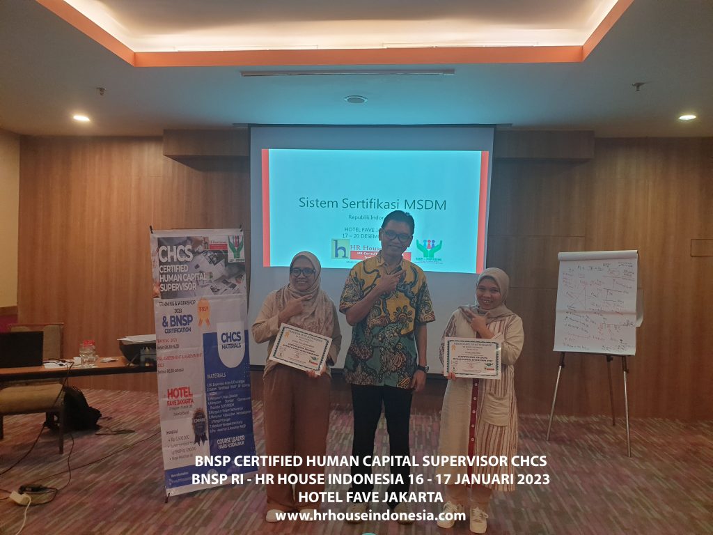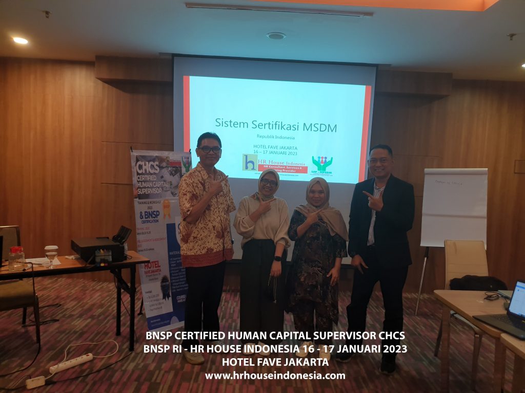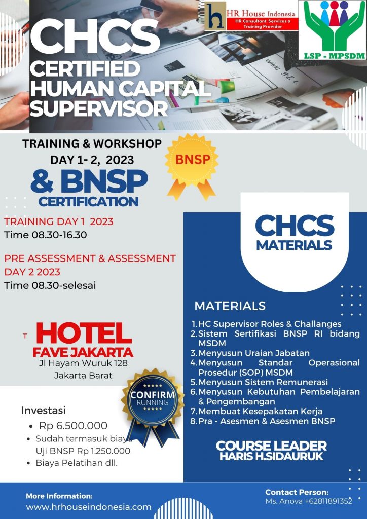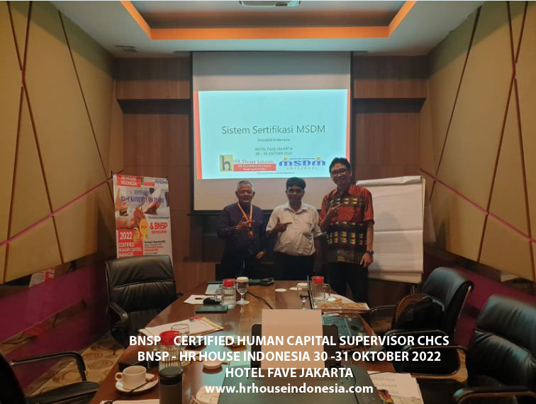 HR HOUSE INDONESIA sebagai lembaga diklat profesi dan Tempat Uji Kompetensi/Sertifikasi bidang MSDM (Manajemen Sumber Daya Manusia) membimbing profesional hingga meraih sertifikasi profesi Badan Nasional Sertifikasi Profesi (BNSP) Republik Indonesia. Skema Certified Human Capital Supervisor (CHCS) BNSP ini sejalan dengan Keputusan Menaker No. 115 Tahun 2022 tentang Pemberlakuan Wajib Sertifikasi Kompetensi Kerja bagi Tenaga Kerja Bidang Manajemen Sumber Daya Manusia