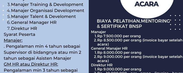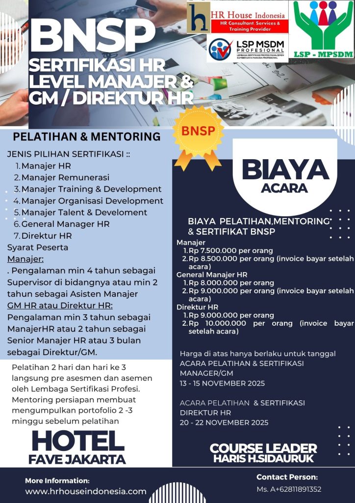 SERTIFIKASI HR – BNSP LEVEL MANAGER & GENERAL MANAGER / DIREKTUR HR with HR HOUSE INDONESIA NOVEMBER 2025 – OFF LINE CLASS (BIMTEK 2 MINGGU SEBELUM ACARA TRAINING, TRAINING DAY1 – DAY2 dan DAY 3 LANGSUNG PRE ASSESSMENT- ASSESSMENT di HOTEL FAVE JAKARTA)